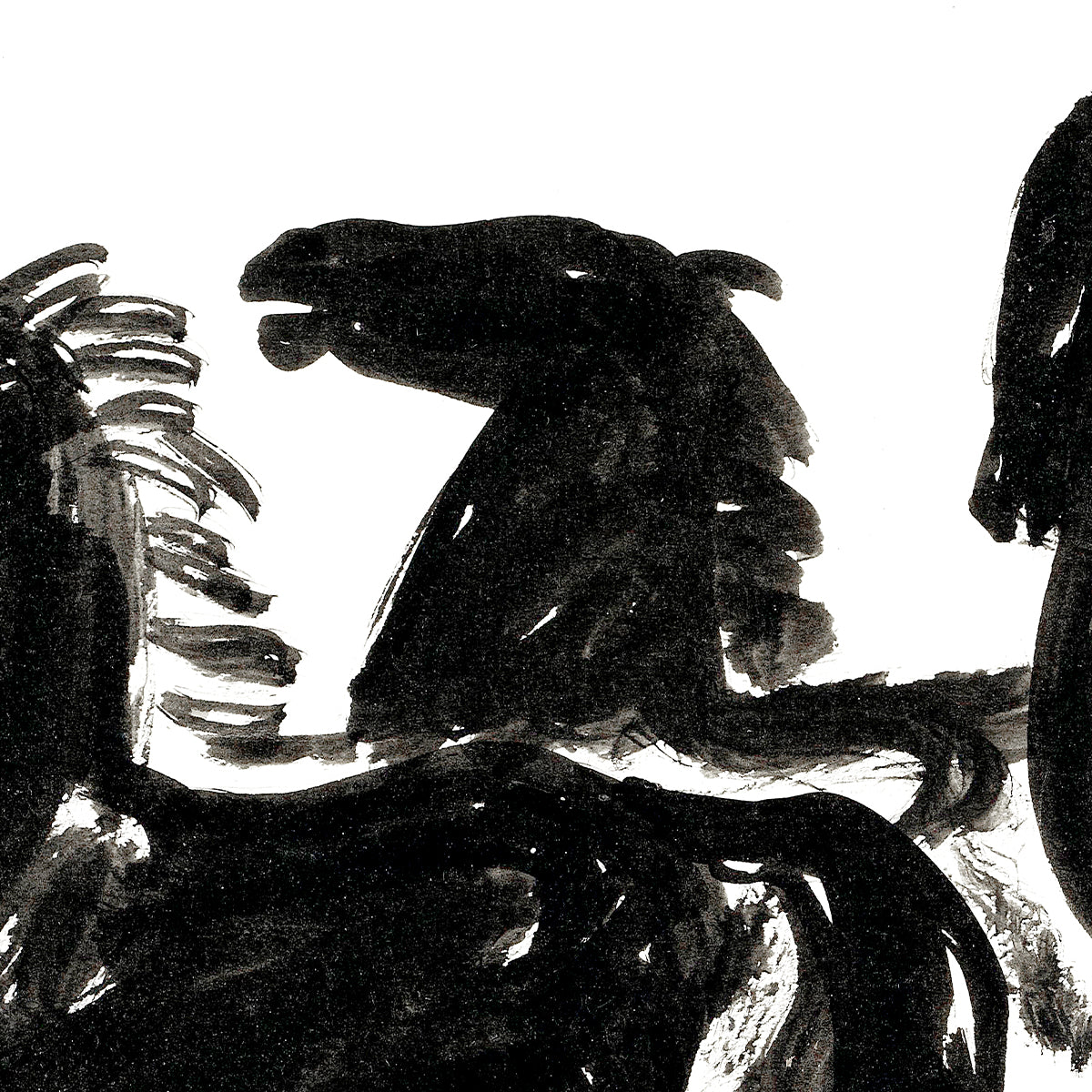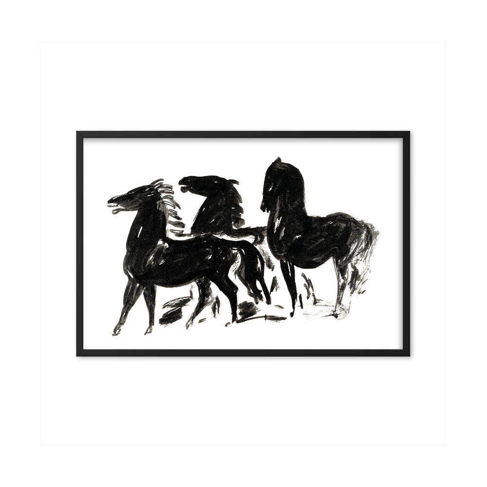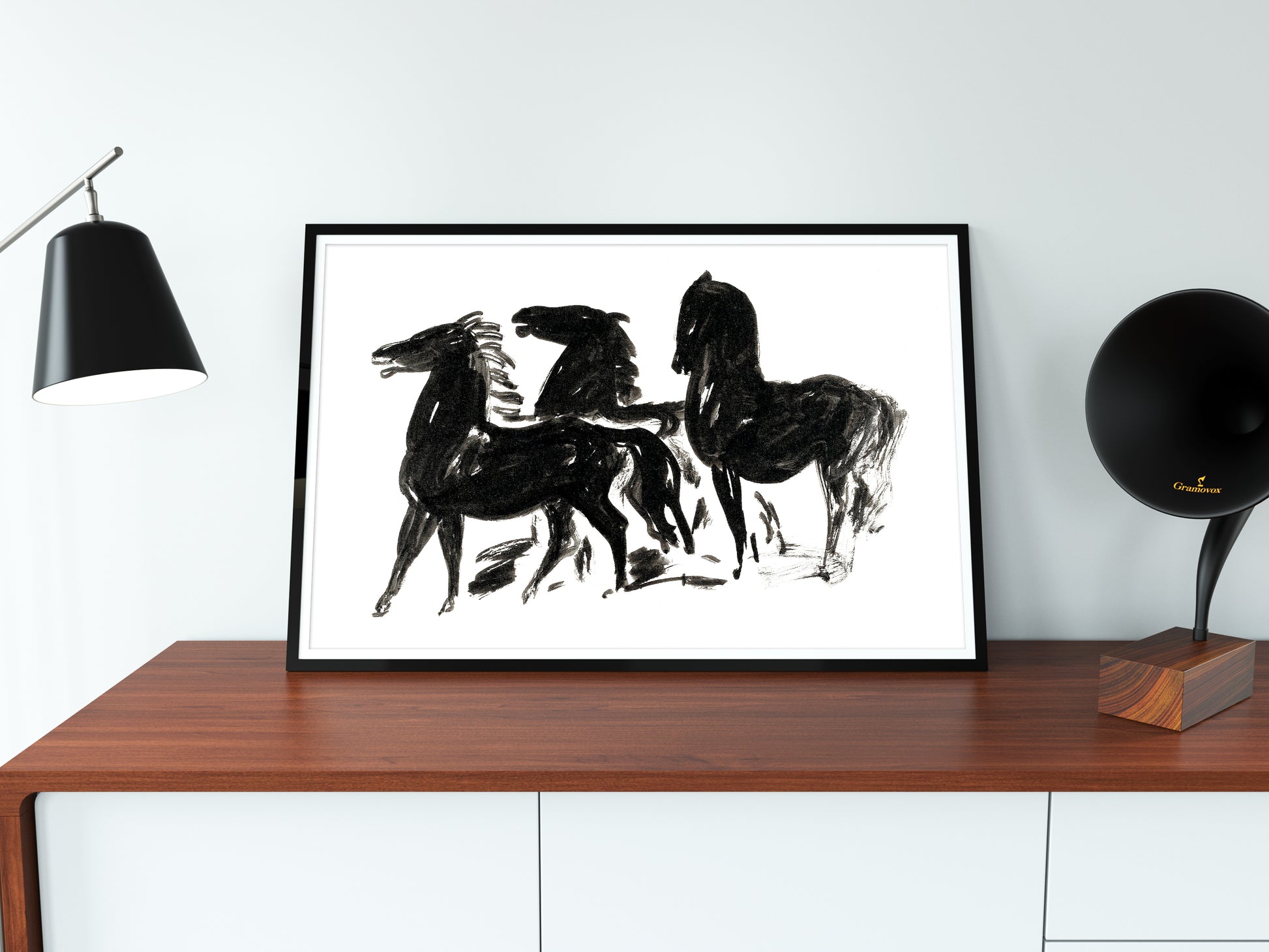 Title: „Drie zwarte paarden staand naar links lijkend“