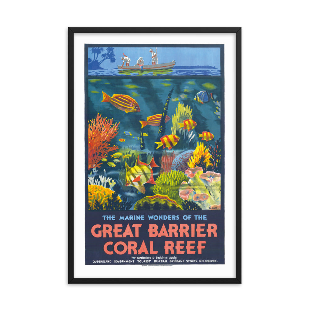 Vintage Travel Poster - Painted design featuring water reef scene with people in a boat fishing, Queensland State