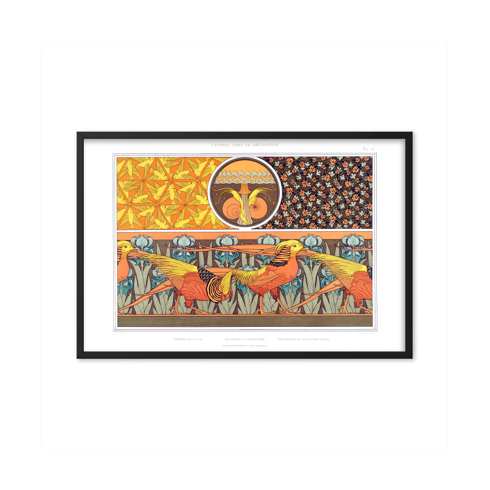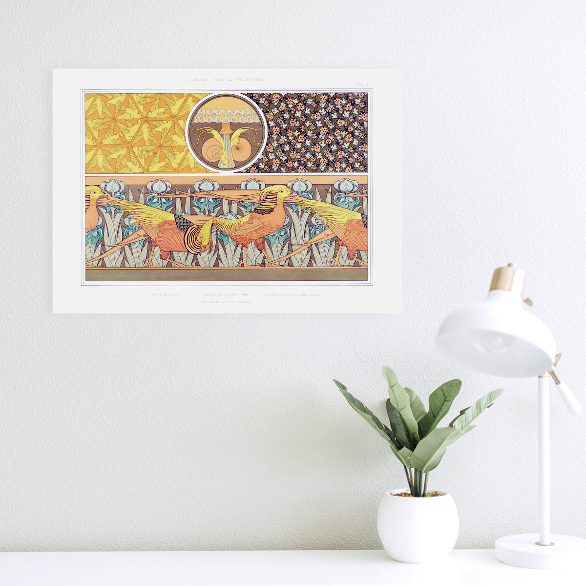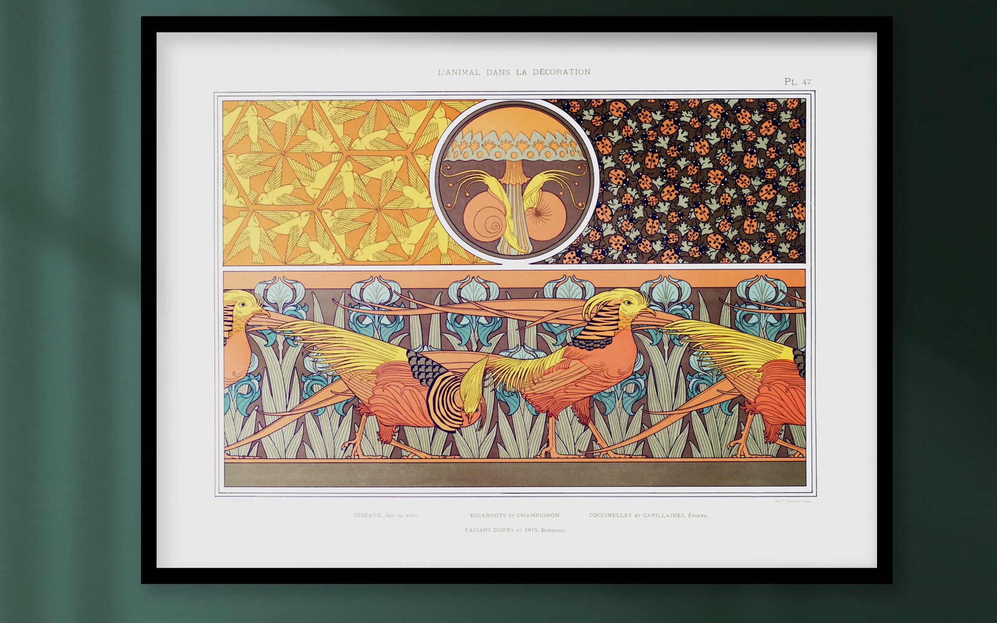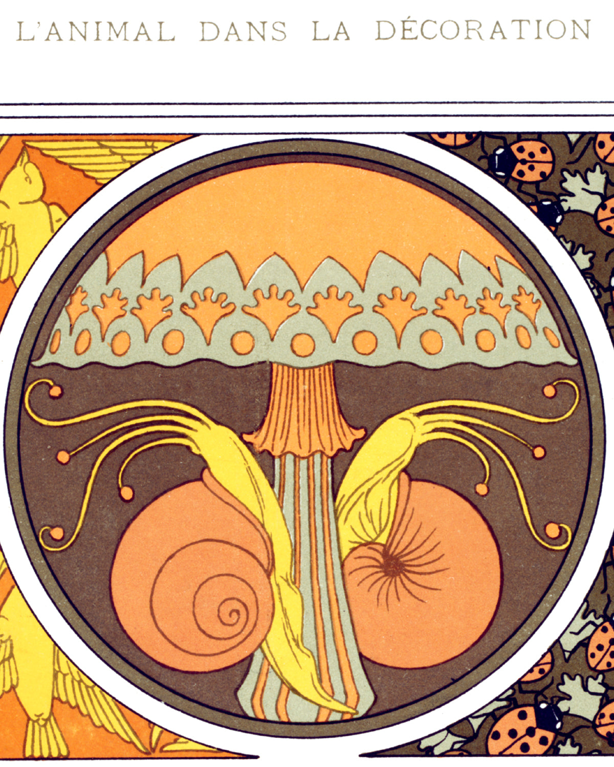 In his 1897 portfolio "L'animal dans la décoration", Verneuil shows a rich variety of patterns based on plant and animal forms: Birds, fish and other sea creatures, shells and insects (including the popular fin-de-siècle motifs butterflies and dragonflies), and plant environmental forms such as flowers and trees. He reduces living creatures to playful decorative elements and geometric patterns, providing dozens of striking examples that interior designers can use as models when creating wallpaper, textiles, decorative hardware, or painted borders and friezes.