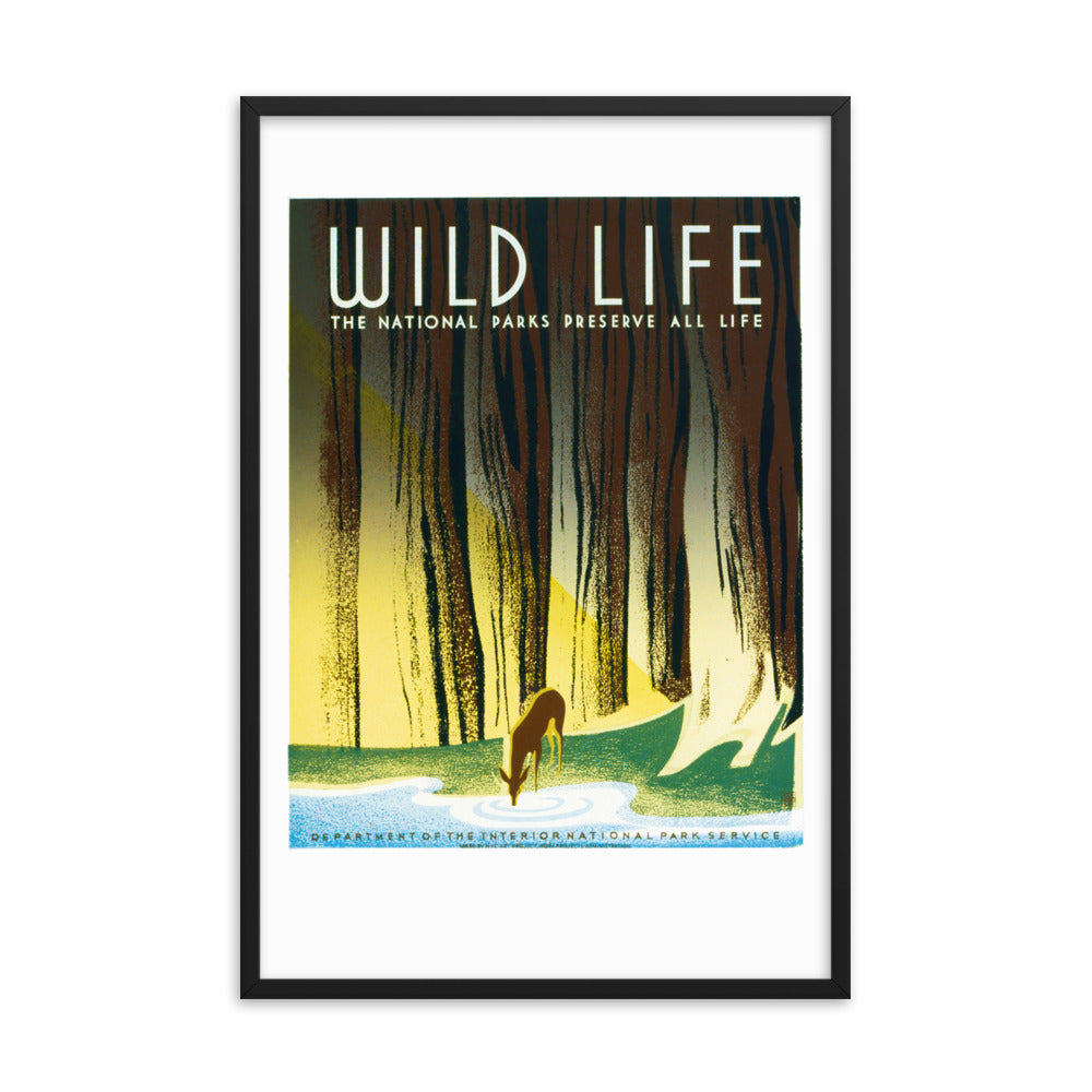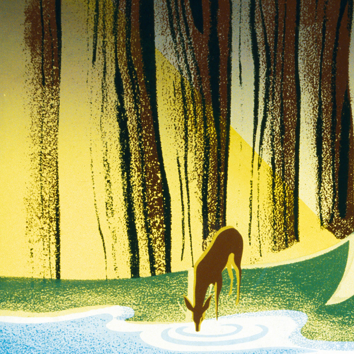 Poster for National Park Service, showing a deer drinking from a stream in the forest.